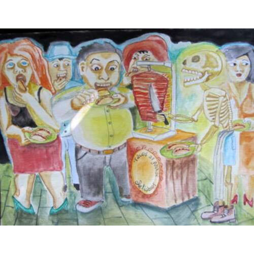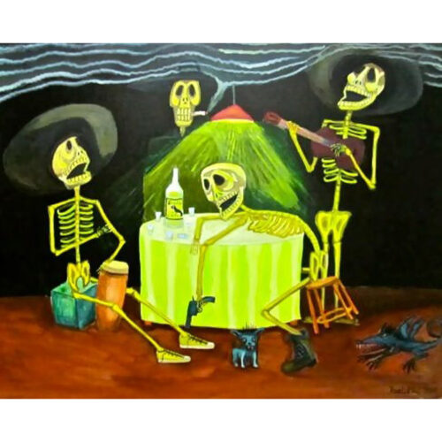 calavera, naked ladies, painting, people, skeleton, village