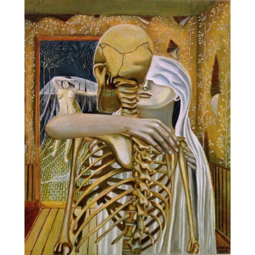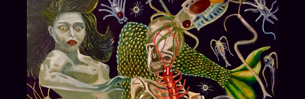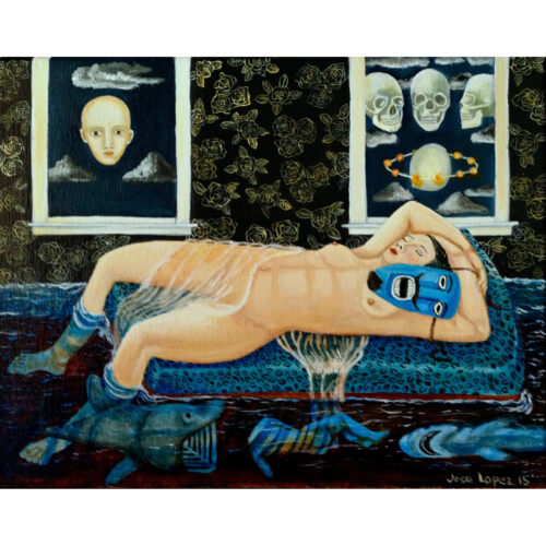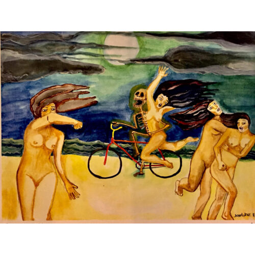2019, calavera, naked ladies, oil, painting, people, skeleton, surrealism, water